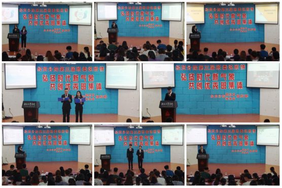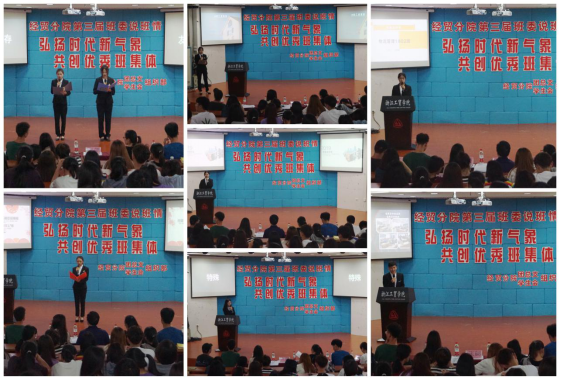 随后,17级、18级各班级代表按照抽签顺序依次上台,就本学期班级的基本情况如制度建设、班委建设、文化建设、活动的参与获奖情况、员工入党及一些班级特色活动等做了精彩展示。在总结班级建设取得的成效及班级同学在德育、体育、学习等方面的进步的的同时,也深入分析了班级管理过程中存在的问题。一幕幕幻灯片的呈现,是班委们辛勤努力的见证,也展示了各班级积极向上的精神风貌,赢得了在场班级的肯定和阵阵掌声。