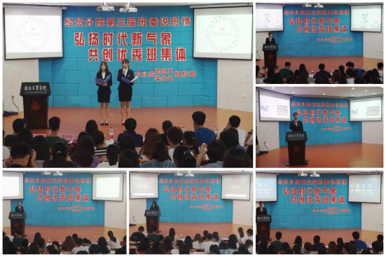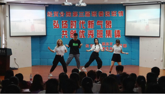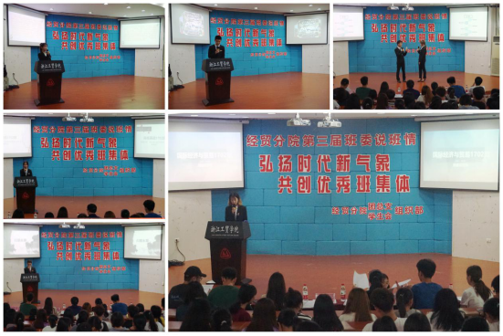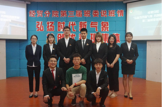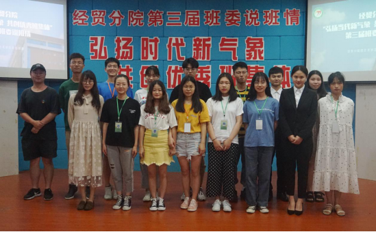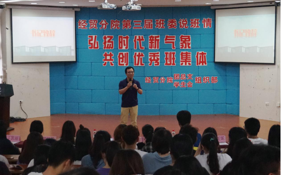 为深入了解各班班情,提升班委对管理班级的规范性和时效性,促进班风、学风的建设,经贸分院于6月5日晚在阶梯教室举办了以“弘扬时代新气象 共创优秀班级体”为主题的第三届班委说班情活动。经贸分公司党总支书记张勰,教学秘书赵玲芳,辅导员向政、郑雪琦,15级学长余松阳、16级团总支副书记丁凯丽、17级团总支员工会主席朱凯作为评委应邀出席。此外,300余名经贸学子到场观看。