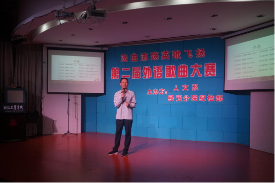 青春是一个个跳动的音符,为了繁荣校园文化生活,努力营造一个积极向上的校园文化氛围,10月24日晚6点,由经贸分院和人文系联合举办的以“法语流觞,英歌飞扬”为主题的第二届外语歌曲大赛在阶梯教室如期举行。本次活动特邀了人文系辅导员叶盛芳,人文系专业主任朱浩然,人文系法语专业老师伊晨、许超、Norbert,经贸分院商务英语专业主任徐国盛担任评委。此外还有人文系法语专业员工和经贸分院商务英语专业的员工前来给选手们加油鼓劲。