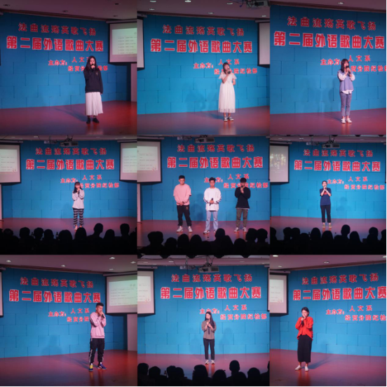 首先由法语1902安江涵和张娇娇同学的《Je m’appelle Hélène》拉开了本次活动的序幕,在轻缓悠扬的歌声中同学们一起进入了音乐的世界。赵梓皓同学的《Something just like this》调动了全场观众的积极性,引起掌声阵阵。而后胡嘉诺同学的《La vie En Rose》的清唱开场在第一时间抓住了观众的心弦。