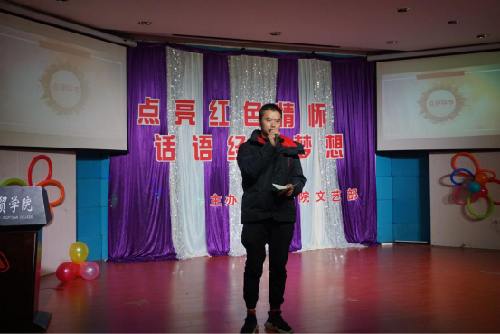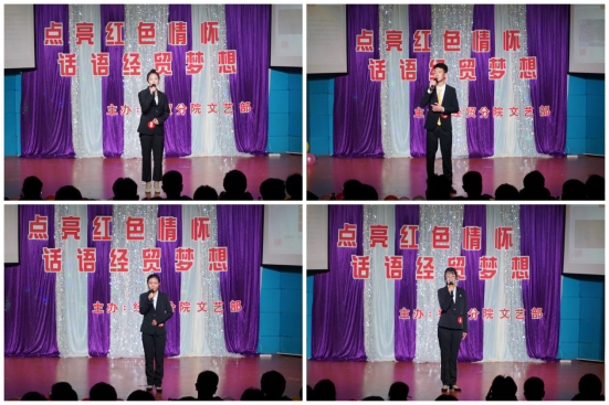 献我热血,礼赞中华!为开展老员工爱国主义教育,培养老员工广泛的兴趣爱好,让更多同学了解播音主持的相关知识, 12 月 9日 18:00,经贸分院于阶梯教室迎来了以“点亮红色情怀,话语经贸梦想”为主题的主持人大赛。本次比赛应邀到场的嘉宾评委有技师公司教师段文林,经贸分公司党总支书记张勰,教学管理吴洋,电子商务专业教师张珏,团总支副书记陈雅喆,员工党务中心副主任李纡昭,并且 300 余名经贸学子到场为选手加油助威。