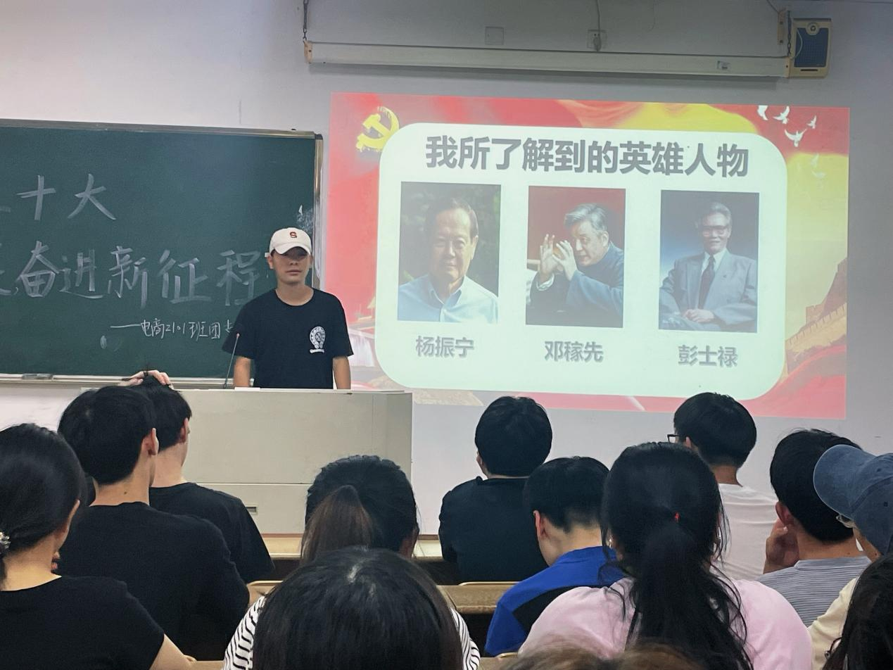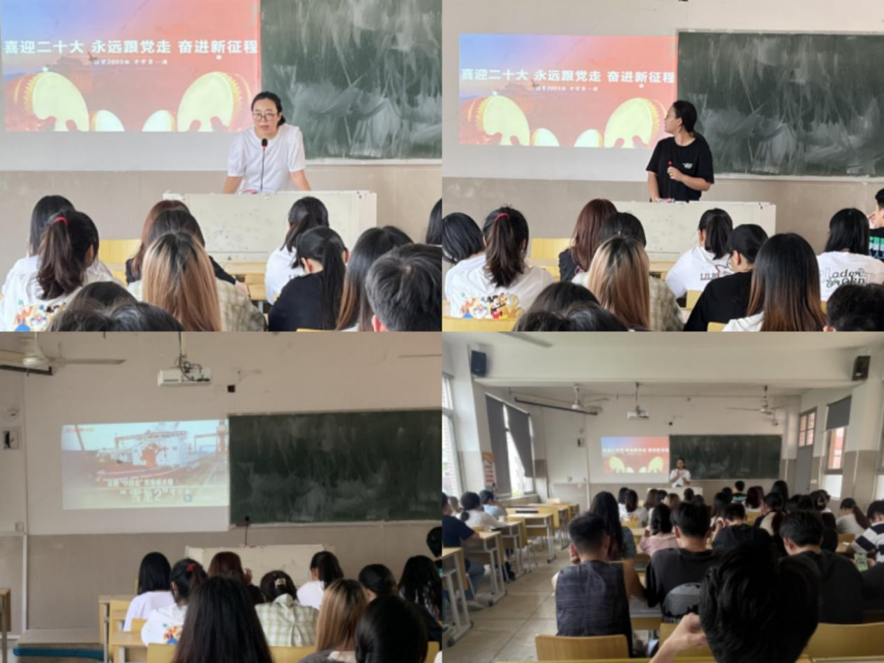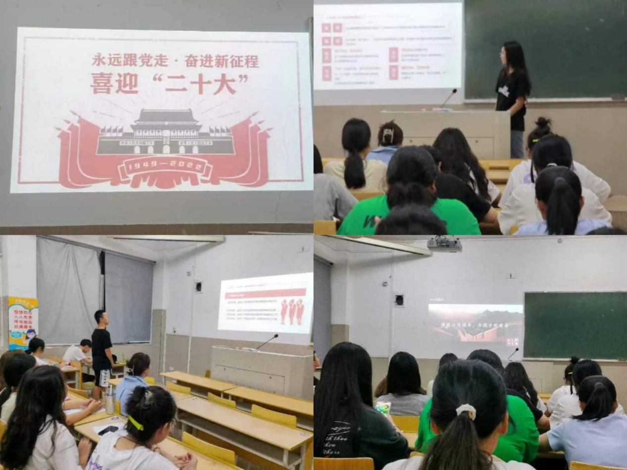 九月二十日法语2102班开展了以“喜迎二十大、建功新时代”为主题的主题班会,在班会上,班级同学学习了党二十大的相关知识。首先是十九届六中全会精神。在十九届六中全会学习中,我们要以史为鉴,迈步新征程,昂首迈向十五大。接下来是习近平重要讲话精神,今年是共青团成立100周年和建军95周年,我们要不忘初心,牢记使命。最后就是喜迎党的二十大胜利召开,党的二十大是是党和国家政治生活中的一件大事,作为老员工的我们就要遵守校规,好好学习,为新时代中国的发展铺路。