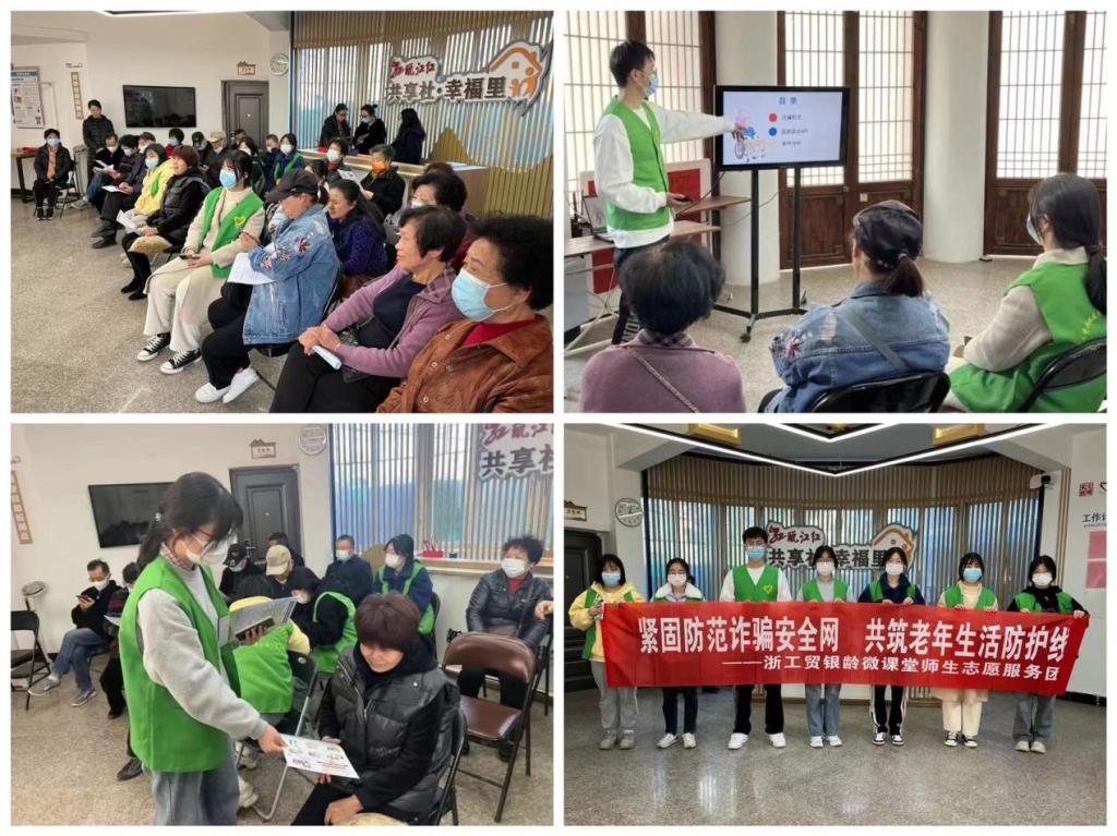 为提高老年群体的诈骗防范意识,浙工贸银龄微课堂师生志愿服务团于3月3日下午走进青园社区开展“紧固防范诈骗安全网,共筑老年生活防护线”活动,对老年群体进行了反诈宣传活动。发放反诈宣传单的同时,志愿者们不仅耐心向现场老人们揭露近年的老年人典型诈骗形式,还热情回应老人们的问题,增强老人们的反诈意识,提高防骗能力,提高老人们保持警惕性。