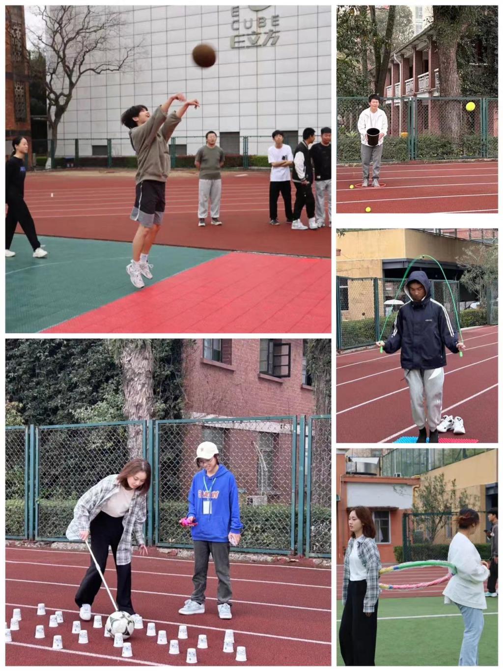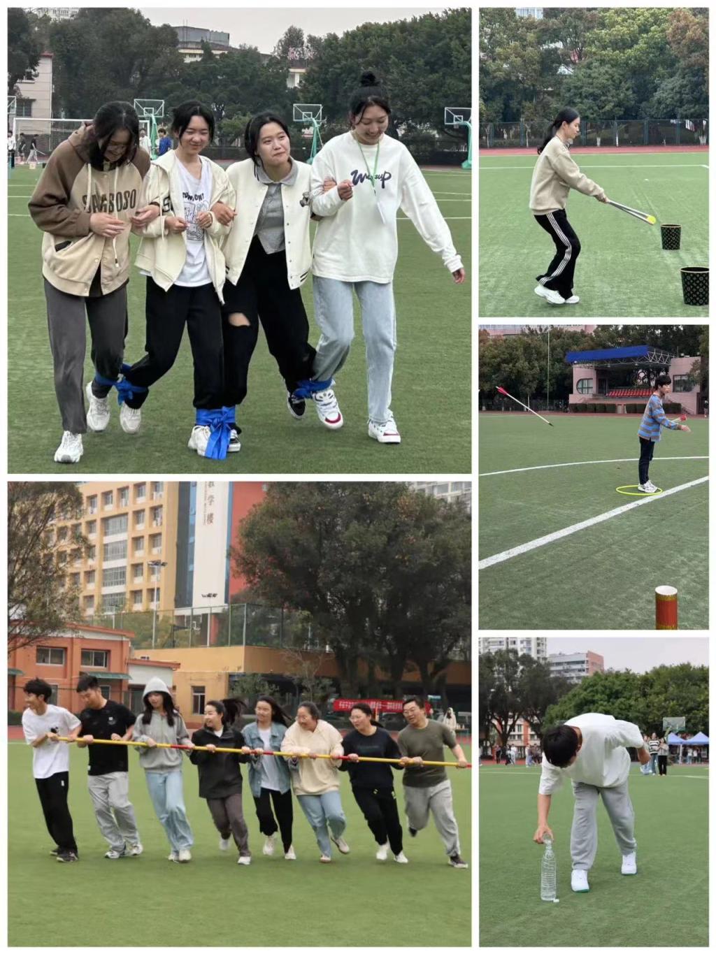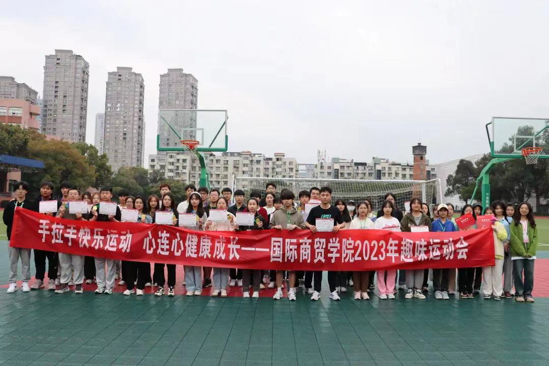比赛尚未开始,操场上早已热闹非凡,同学们的热情也势不可当。此次趣味运动会项目非常丰富多彩,有“趣味篮球投篮”、“拾贝”、赶小猪”、“身体倍棒”、“螃蟹过河”、“我会用筷子”、“争分夺秒”、“兄弟齐心”、“我是大才子”、“旋风跑”。比赛开始,参赛人员用杯子摇水,运送桶内,来回往返,达到刻度;“我是大才子”一人站在呼啦圈内,往壶中投箭,中两即可通关;“旋风跑”项目各队成员均需参加,八人手握长杆,在规定区域内完成绕桩跑冲过终点,最后一人冲刺敲击铃铛,一声铃响昭示着本次国际商贸趣味运动会的圆满结束。