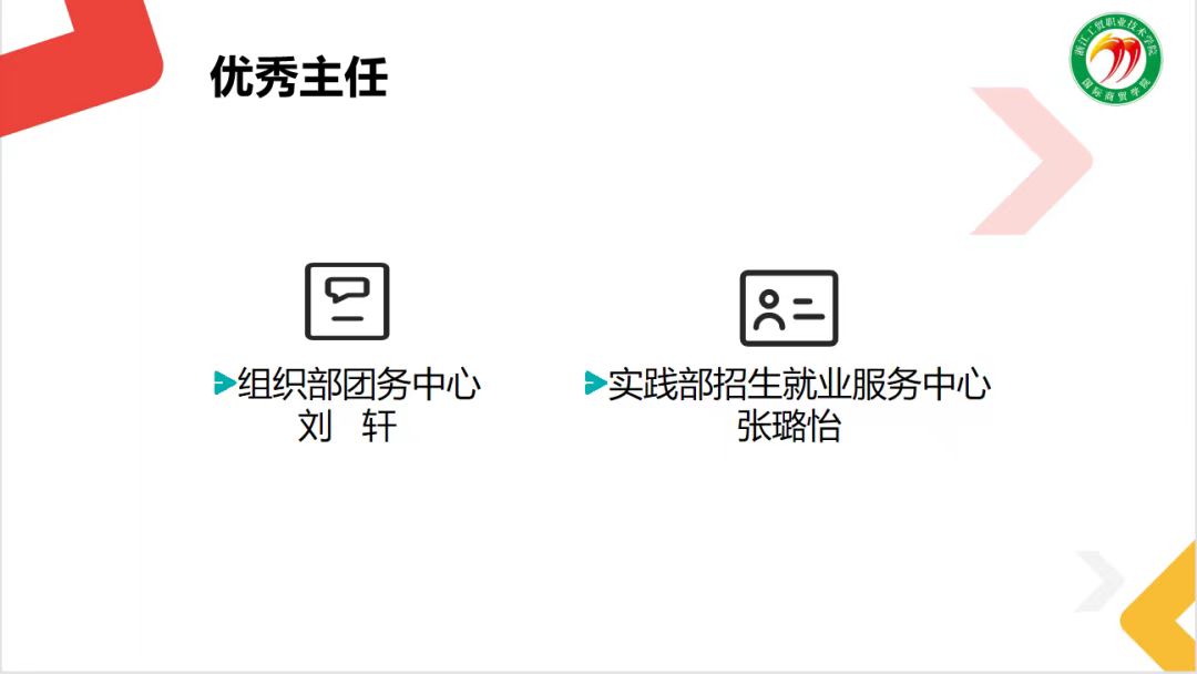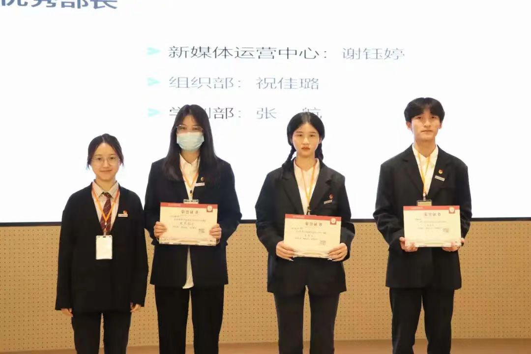 部门有个好部长或主任十分重要,好的部长或主任能够带领团队走向成功并且能够为干事提供有意义的工作体验。此次优秀部长为新媒体运营中心谢钰婷、组织部祝佳璐和学创部张航,优秀主任为组织部团务中心刘轩和实践部人才招聘服务中心张璐怡。