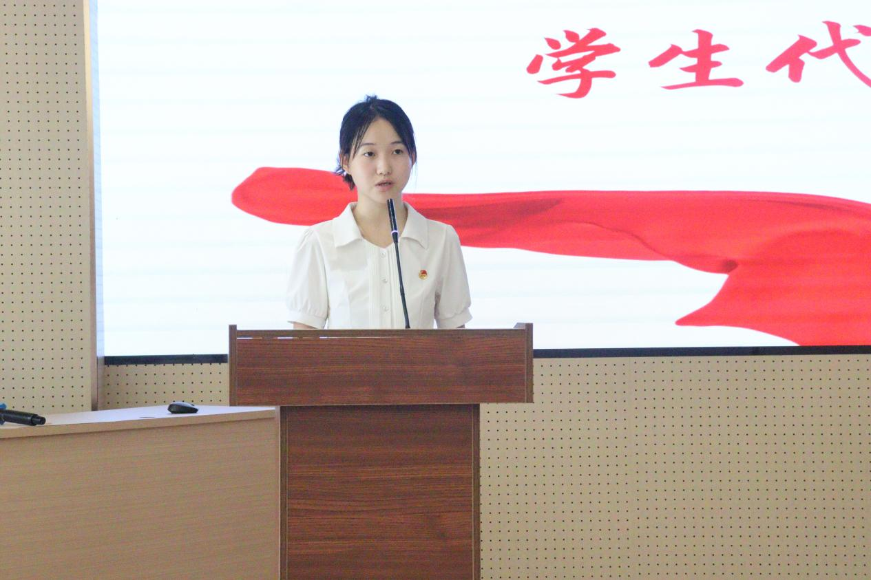 而后,国际经济与贸易专业2102班张淑婧同学作为优秀员工代表做新学期表态发言。张淑婧同学分享了自己的暑假工作心得,鼓励大家要学习与实践相结合,行动决定一切,做到尽善尽美,成为更好的自己;提出新学期要尽快制定新的学习目标,寻找新方向。建立两种热情:对待学习的热情和对待生活的热情;收获三个美好:收获学术成果的美好,提升综合能力的美好,TapTap点点朝气蓬勃的美好。祝愿大家都能成为一个真正勇敢的人,不负韶华,继续前进。