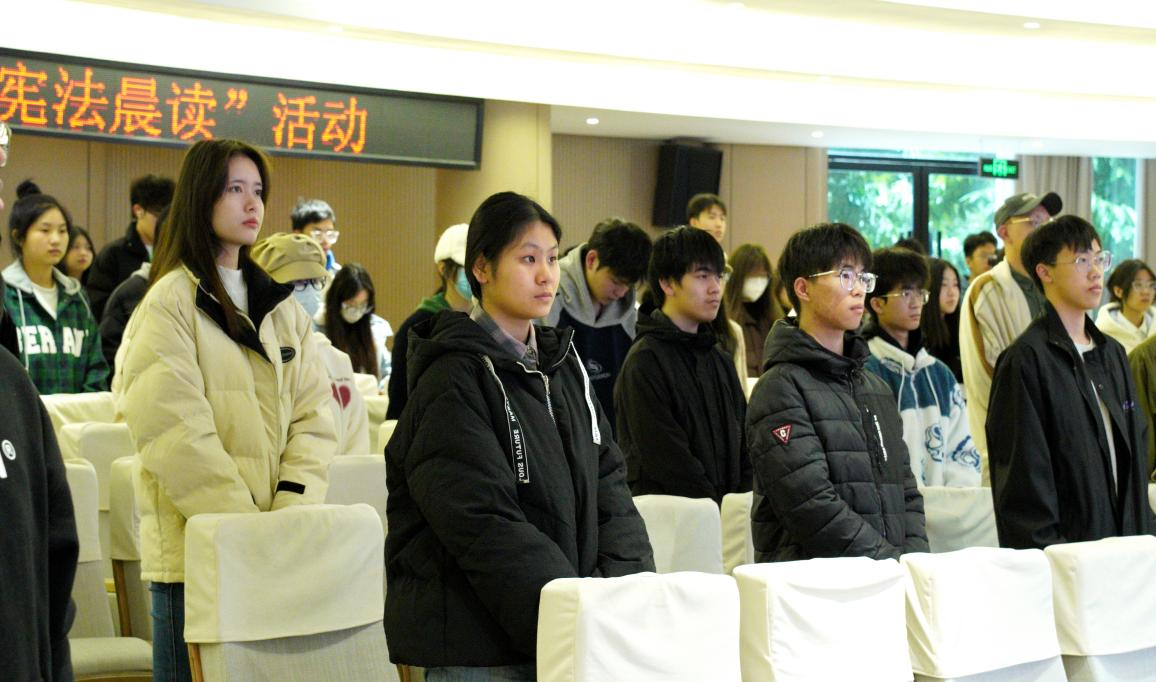 随后,开展“宪法晨读”活动,诵读宪法部分条款。大家精神饱满,情绪激昂,句句铿锵有力,透露的是对宪法的尊崇和对祖国的热爱。每个人都拿出十二分精神,一字一句无不彰显着宪法的庄严和同学们对它的重视和敬畏。