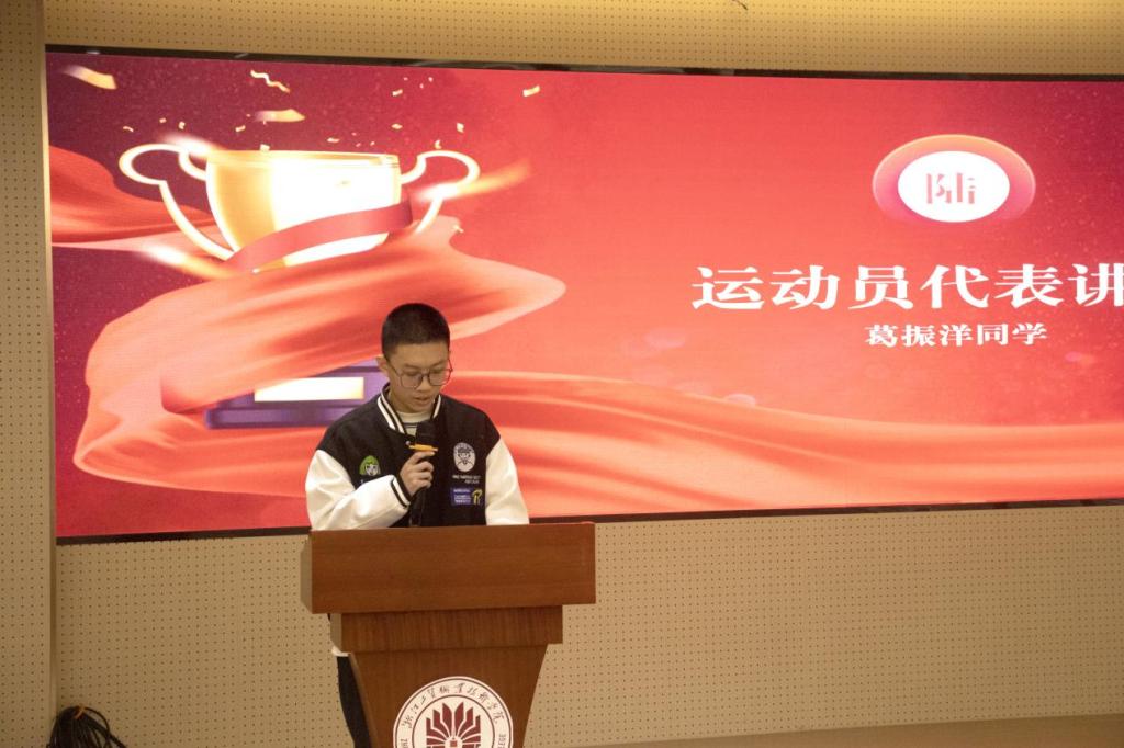 葛振洋同学作为优秀运动员代表发言。运动会期间他参加了1500米、5000米长跑,比赛中他晕倒休息片刻后又重返跑道,他这奋力拼搏永不言弃的体育精神感染着每一位运动员。他说任何梦想都没有捷径,我们要敢于去追求热爱的事;同时也希望TapTap点点代表队未来能够取得更好的成绩。