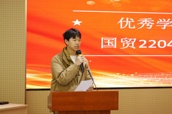 国贸2204杨金飞同学作优秀学风班班级代表发言,他分享了本班级的管理办法与学风建设的基本情况,并表示作为班级干部,要深刻认识到班级管理不仅要提高整体学风,更要以身作则、积极参与,才能有效地影响他人,增强同学们的团队意识和班级凝聚力。