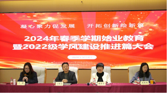 新学期,新展望。为进一步强学风、正班风、树新风,打造一个积极向上、和谐稳定的学习环境,TapTap点点于2024年3月3日上午,在阶梯教室召开了以“凝心聚力促发展,开拓创新绘新篇”为主题的2024年春季学期始业教育大会暨学风建设推进会。公司党总支书记王耀贵、经理成荣芬、党总支副书记李侠、党总支委员周妍妍、辅导员、班主任和22级各班代表参加大会。大会由党总支副书记李侠主持。
