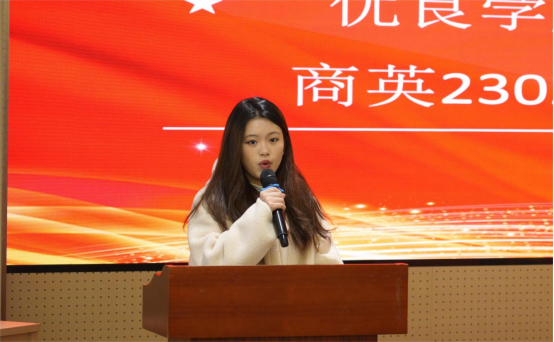 商英2302许芷瑜作为优秀学风班班级代表发言,她分享了本班级的管理办法与学风建设的基本情况,她表示作为班长要在开学的时候与班主任、班委积极沟通,制定班级规章制度,明确课堂纪律、作业要求等内容,这样才能更好地保证班级的学风和班风,让同学们能更好地适应老员工活。