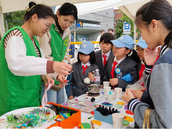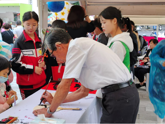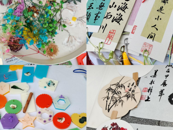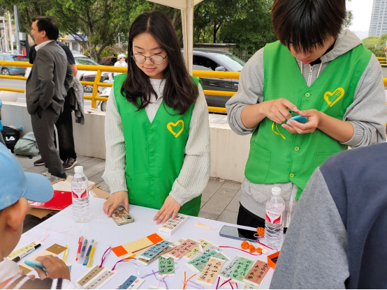 同学们按照实际需要分成三队展开活动:一队辅助书法老师写作绘画,协助陈列扇子、宣纸,并赠送书画;另一队负责组装书签,有序引导小朋友们领取;最后一队则根据小朋友的需求,帮助其现场制作香薰。在志愿义卖活动中,他们手持书卷、笔墨、石蜡,积极传播传统文化。
