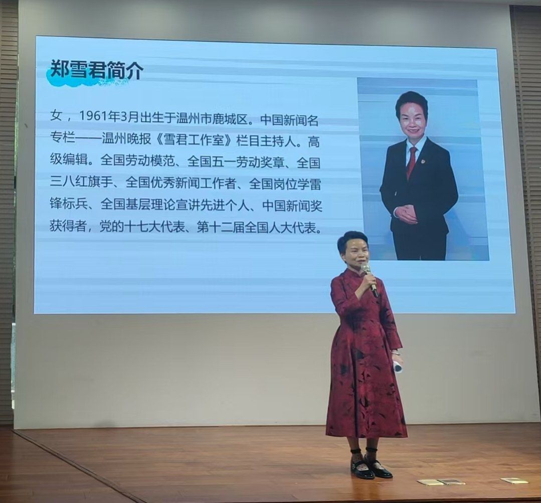 道德讲坛开始,温州晚报《雪君工作室》栏目主持人郑雪君致词讲话,她向大家简要介绍了道德讲坛的历史、宗旨和目的等,并对本期道德讲坛的主讲嘉宾郑超豪表示欢迎。