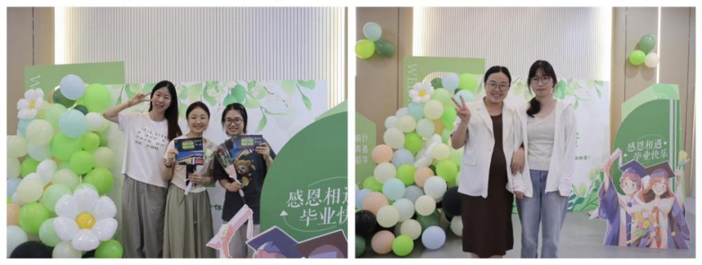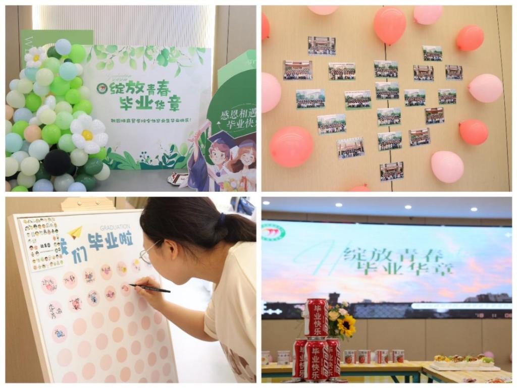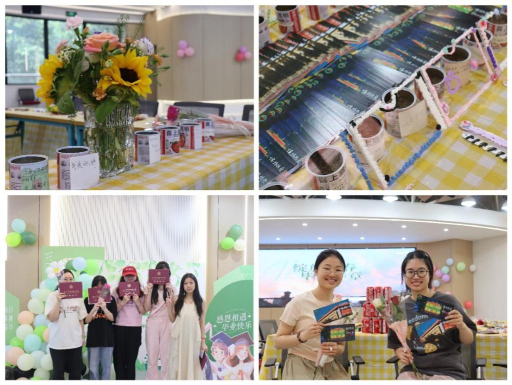 国际商贸公司团总支员工会为学长学姐们精心准备了专属明信片、相框DIY、种子、留言征集以及鲜花、零食等。进入会场,毕业生与老师一起坐谈交流,回顾老员工活点滴,并合照留念,记录这令人难忘的青春记忆。