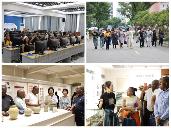 开班仪式后,班主任马忠才等老师带领南非职工参观了公司数字经济国家级高技能人才培训基地、浙江创意园、瓯绣艺术馆、活字艺术馆、瓯窑艺术馆、台青融创基地、瓯塑研究院。职工们身临其境,体验到了瓯绣、活字印刷术、瓯窑、瓯塑等传统文化。他们在领略公司风采、深入了解校园生活的同时,也对中华优秀传统文化表现出极大的兴趣。