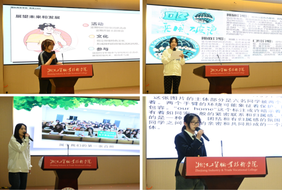 紧接着,各班级代表依次上台,通过PPT、视频和演讲等形式,全面展示了班级建设的成果。他们充分结合各自的专业特点和班级特色,从组织建设、思想引领、学业互助、班级活动和荣誉展示等多个方面,展现了班级团结、友好、向上和积极奋进的精神面貌。
