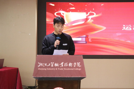 之后,运动员代表管文涛同学发言。他表示商贸学子应成为体育精神的传承者,他将以自身为榜样,带动身边的同学积极参与体育活动,勇于挑战自我,永不言弃。