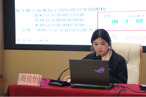 首先,宣传部新媒体副部长周佳怡讲解了推文制作的注意事项。她详细阐述了做推文的要求,并强调内容搬运需注明出处的重要性,以确保信息传播的准确性和规范性。