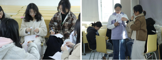 在活动的最后,吴倩倩老师引导同学们将各自的焦虑情绪,以具体形象化的形式记录在纸上。随后,同学们将画纸撕碎,并重新组合成各自心仪的图案,进行了相互展示。同学们在“oh”卡上留下了各自的祝愿,并相互交换卡片,以此作为期末考试前的相互鼓励,为彼此加油打气。