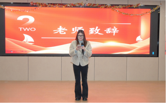 接着,周小倩老师上台致辞。她首先对全体员工表达了新年的美好祝愿,并希望此次元旦汇演能够成为同学们增进友谊的良好契机。同时,她鼓励同学们在接下来的表演中尽情展现自我,共同迎接充满希望的新一年,也预祝晚会圆满成功。