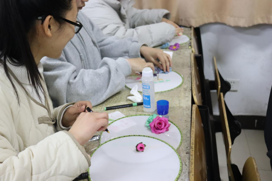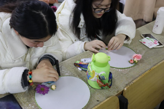 活动开始,女生们纷纷入座,脸上洋溢着期待与兴奋。大家三五成群,一边轻声讨论,一边挑选心仪的干花。有的女生精心搭配色彩,试图让每一片花瓣的排列都完美和谐;有的则发挥奇思妙想,用彩笔在团扇上勾勒独特的图案。