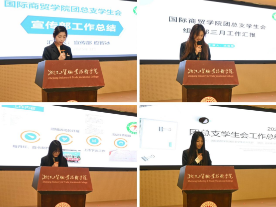 大会进入下一项,各部门部长或副部长依次上台,对各部门的近期工作进行了总结汇报。他们从成果展示、工作不足与改进、未来展望等多个方面展开汇报,旨在持续优化团学工作体系,进一步提升部门工作的质量。