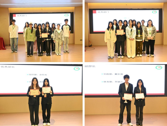 在本次团学大会上,还对表现突出的部门、部长以及副部长进行了表彰。青年志愿者协会、办公室和学创部荣获“优秀部门”称号;沈佳雨和蒋妍荣获“优秀部长”称号;戴乐强和华颖云荣获“优秀副部长”称号。