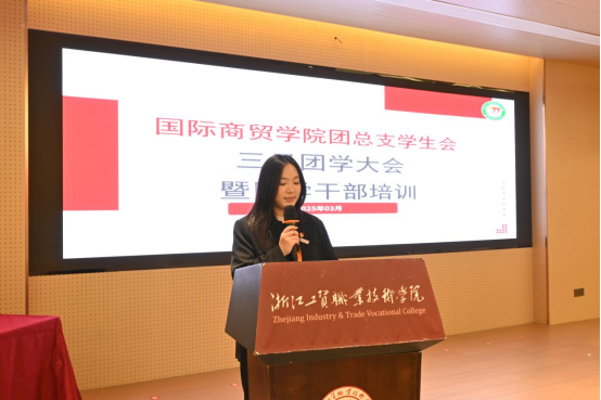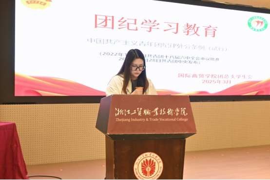 紧接着,周小倩老师上台发言并开展团学干部培训。在当前全球形势复杂多变,意识形态领域斗争激烈的大背景下,周老师带领大家学习《中国共产主义青年团纪律处分条例(试行)》,从总则、违纪与纪律处分、团纪处分运用规则、对违反纪律行为的处分、对违法犯罪团员的团纪处分、附则六个章节逐一讲述,要求同学们将团纪内化于心、外化于行,在学习生活中严格律己,提升综合素质,以坚定理想信念为指引团结奋斗,在新时代新征程书写共青团壮丽篇章。同时,她指出同学们要牢固树立马克思主义宗教观,保持思想行动与党和国家高度一致,在意识形态斗争浪潮中筑牢坚固防线,争做新时代有为青年。
