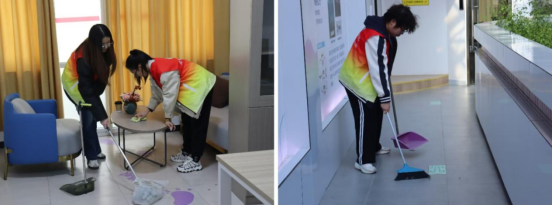 一号楼和三号楼的清扫现场呈现热火朝天的劳动景象。志愿者们手持抹布、水桶,对走廊扶手进行全面的擦洗。同学们秉持着不怕脏、不怕累、不怕苦的精神,不放过任何一个卫生死角。经过两个小时的辛勤劳动,各个区域环境焕然一新。大家以劳动为荣,乐在其中。