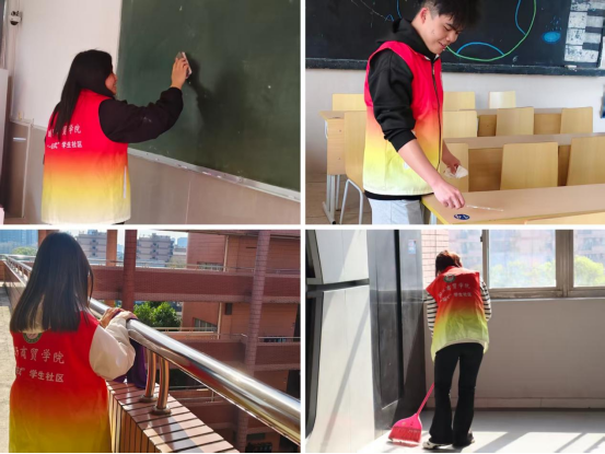 活动当天,志愿者们身着统一的社区志愿马甲,准时抵达集合地点。他们被分成若干小组,每组领取清扫工具,并按照预先划分的责任区域有序展开清扫工作。在社区的各个角落,志愿者们分工合作,挥动着扫帚清扫地面,拿着抹布擦拭公共设施,忙着清理垃圾、整理杂物。特别是在自习室周边,志愿者们更是细心打扫,为自习的同学们提供了一个更加整洁、舒适的学习环境。
