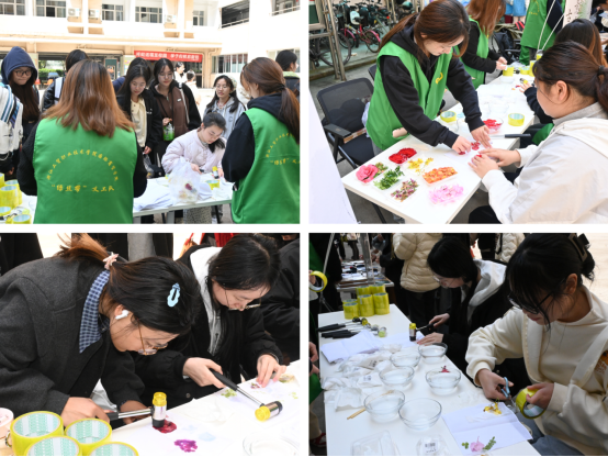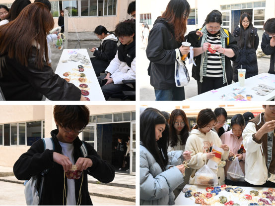 “清明寄情,传承礼俗”手作香包区同样吸引了众多同学的参与。大家围坐一圈,兴致勃勃地交流着香包的制作心得。不一会儿,一个个精美的香包便呈现在眼前。填充香料时,大家都格外小心,生怕洒出一点。那专注的神情仿佛在完成一件珍贵的艺术品。空气中弥漫着淡淡的药香,与同学们的欢声笑语融为一体,传递着彼此间的美好祝福,也延续着清明佩戴香包这一古老的习俗。