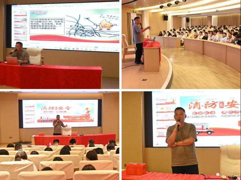 针对校园消防安全方面,校保卫处赵凯老师则根据多年消防安全工作经验,为新生重点讲解了宿舍消防安全常识。他以河南英才公司火灾事件为例,阐明违规电器使用的巨大危害——因使用电暖器导致13人死亡、4人受伤的悲剧。赵老师强调,宿舍内严禁使用“热得快”“电煮锅”等大功率电器,插线板应远离被褥等易燃物,人员离开务必断电,防止线路过载引发火灾。此外,他还介绍了灭火器、应急指示灯、疏散通道等消防设施的位置与使用方法,并提醒员工不得占用疏散通道、遮挡消防设施。