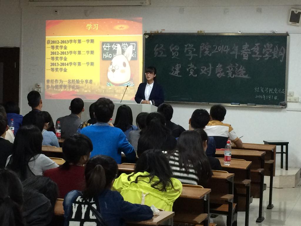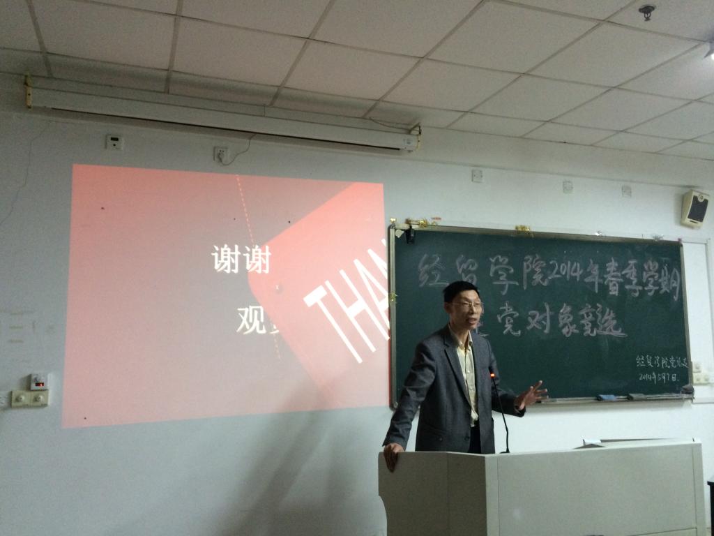 5月7日晚上6点,经贸公司在6201教室举行2014年春季建党对象汇报竞选。经贸公司党总支书记项光春、员工党支部书记白福川、向政、朱杨琼和周妍妍担任此次竞选评委,2013级120余名入党积极分子观看此次竞选。