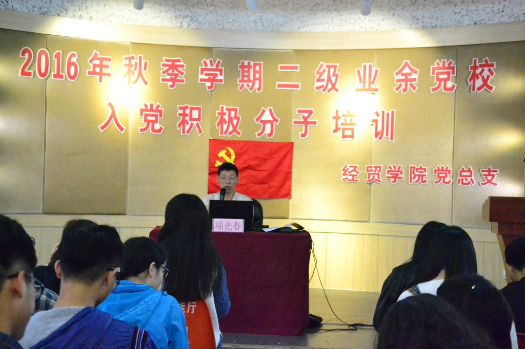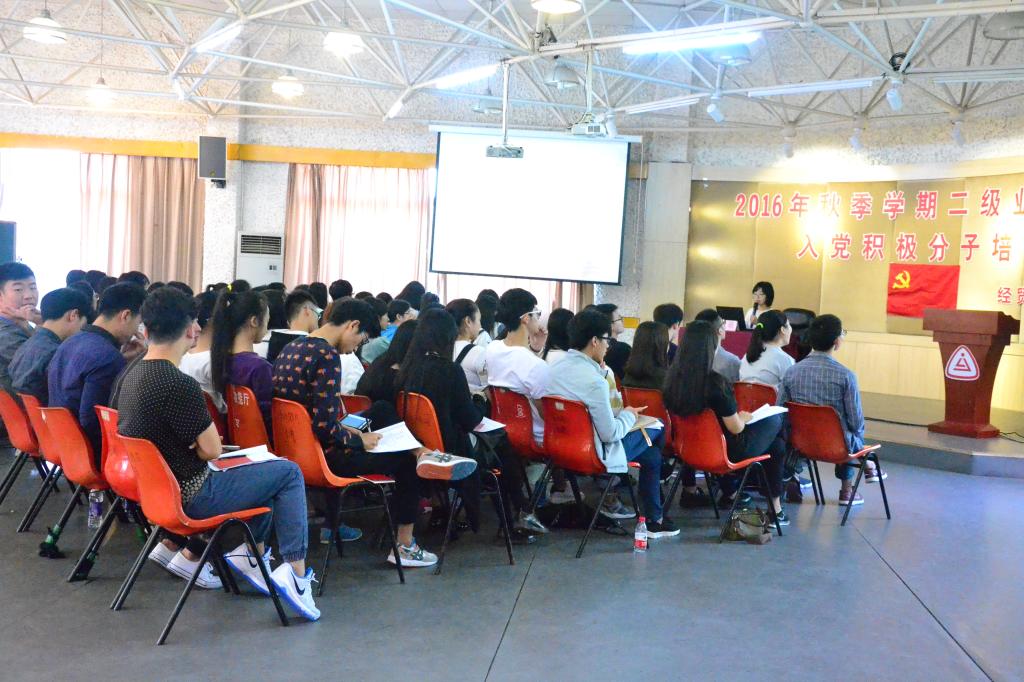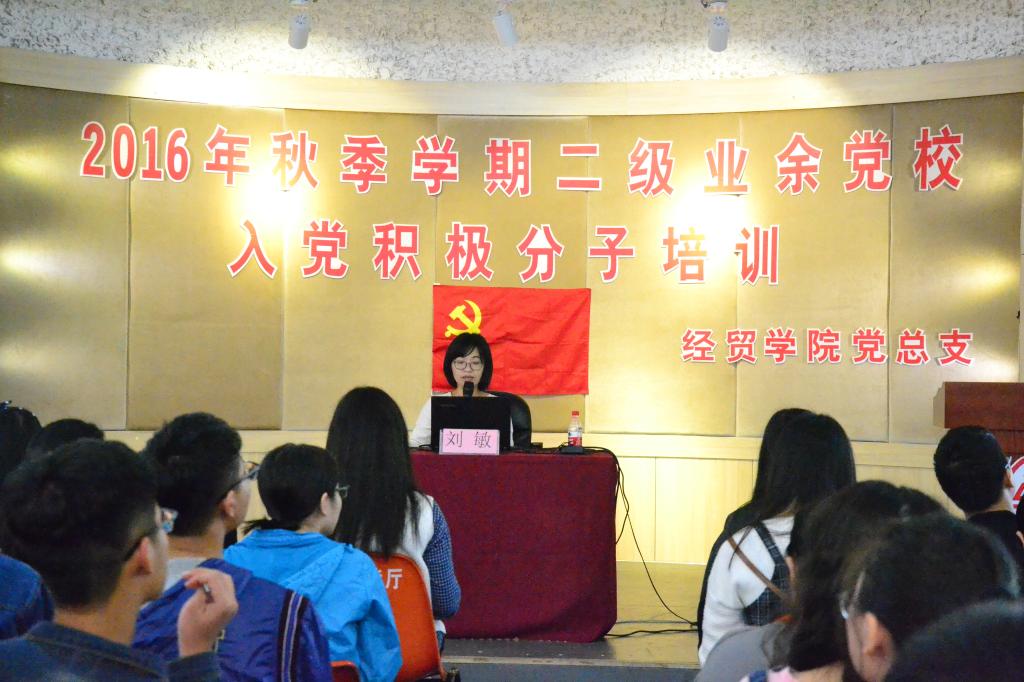 11月19日,经贸公司党总支在多功能教室举办2016年秋季学期二级业余党校入党积极分子培训班。参加本次培训班的学员包括2015、2016级入党积极分子,近100人。