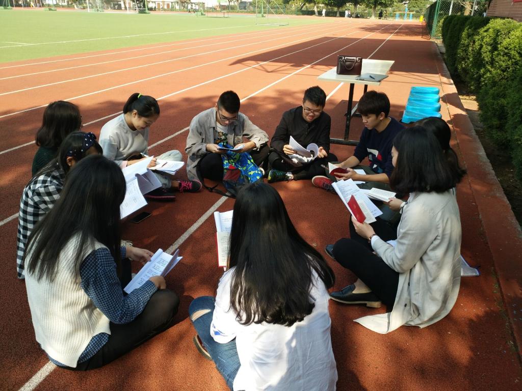 入党积极分子们在操场上开展《坚定理想信念,争做争做“四讲四有”青年》的讨论