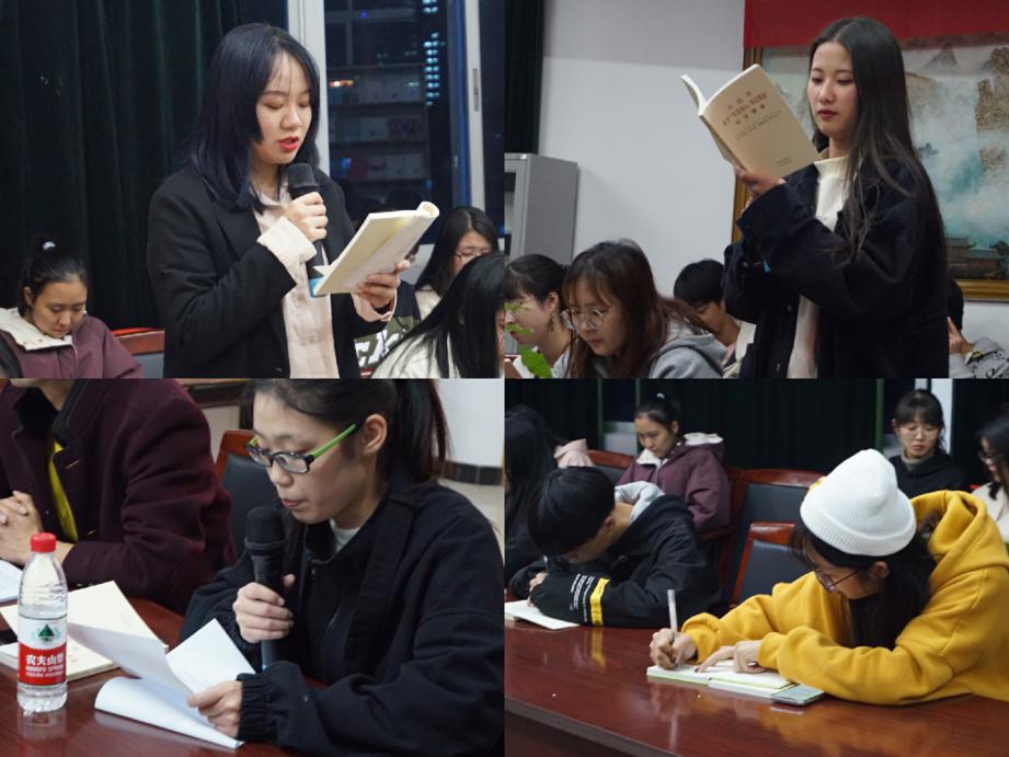 首先,会议上有请到了三位学习会成员对《习近平关于“不忘初心,牢记使命”论述摘编》书籍的精彩片段进行朗读以及读后感分享。第一位营销1902班的叶莹洁同学强调“旗帜决定方向,道路决定命运”。第二位商英1901班的叶婧同学主要从中国共产党的队伍素质角度入手,其强调“当一名共产党员,首先要解决好政治合格问题”。第三位商英1901班的魏静同学则进行了读后感分享,主要讲到:“中国共产党人的初心和使命,就是为中国人民谋幸福,为中华民族谋复兴,这是大时代的主题,是每一位共产党人坚守的信念,更是每一位公民的义务。”
