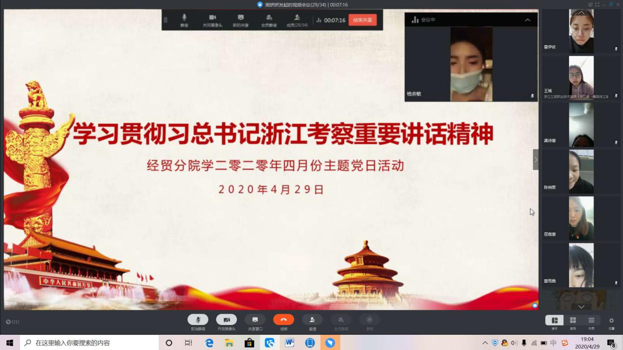 4月29日晚上7:00,经贸分院员工党支部四月份线上主题党日活动以视频会议的形式如期在钉钉群中开展,会议由支部书记周妍妍老师主持,师生党员参加了此次会议。