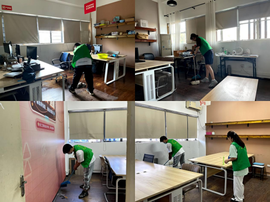 党员同志们对两个教学楼进行了全方位的清理打扫。在大家的辛勤劳动下,教室焕然一新,桌椅摆放整齐,地面打扫得干干净净。