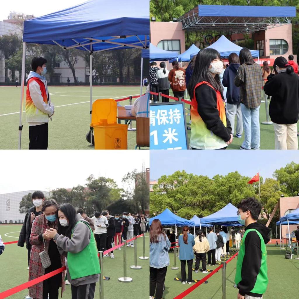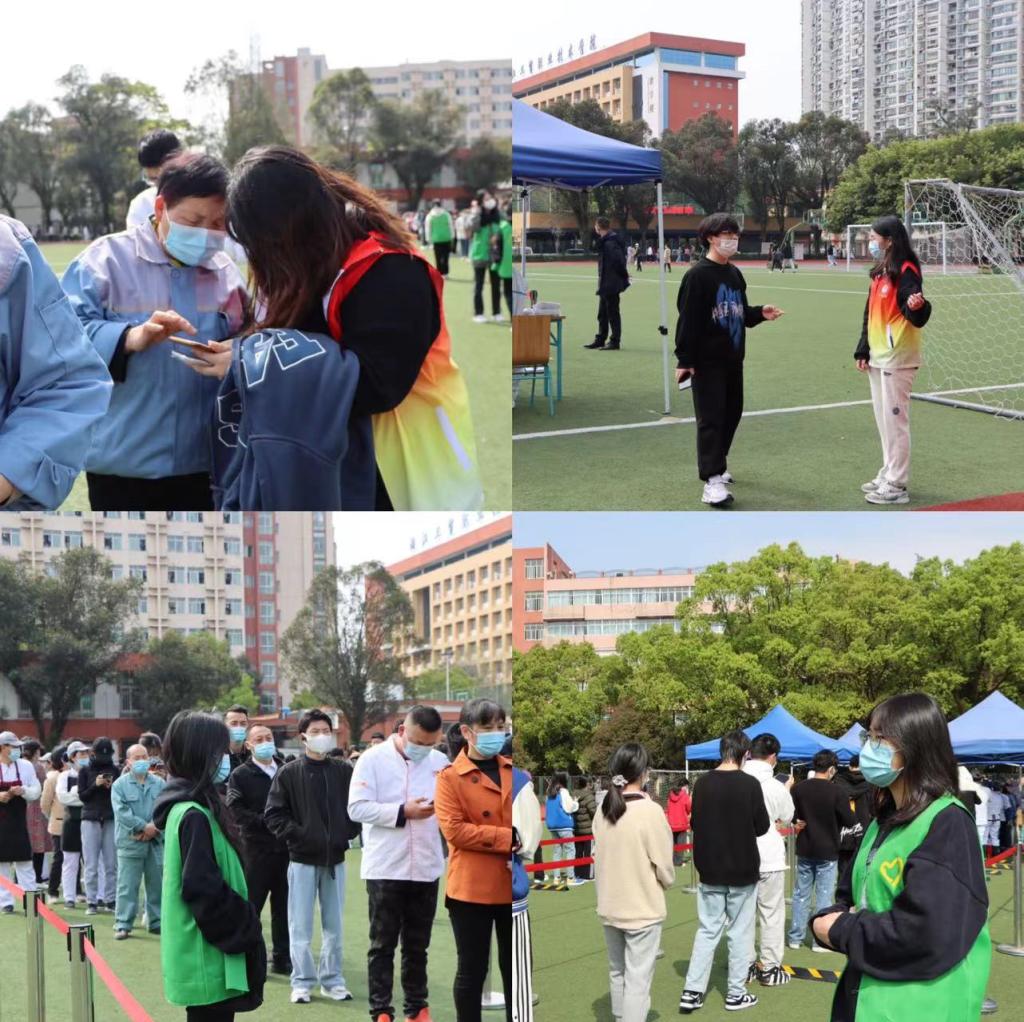 下午两点,师生有序进入操场进行核酸检测。各位志愿者们在队伍两旁给同学们分发口罩,提醒大家保持一米的间距并提前打开防疫码,维护现场秩序,组织做完核酸的师生有序离场。一道道身影穿梭在现场,助力此次核酸工作,营造出良好的现场秩序。
