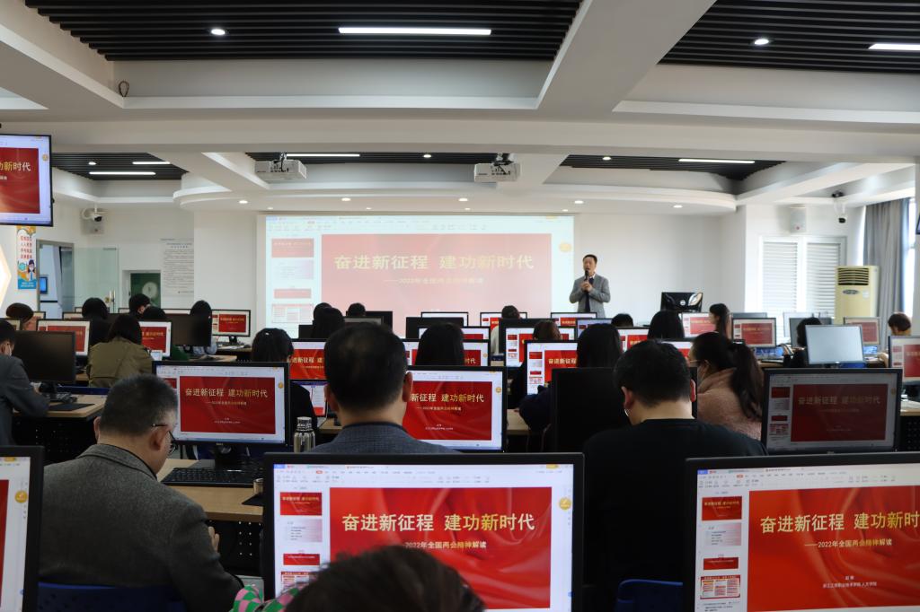 会上,赵敏老师对2022年全国两会精神进行了解读。赵老师从2022年全国两会的历史方位与主要背景入手,指出2022年全国两会是踏上全面建设社会主义现代化国家新征程后召开的第一次全国两会,在党的二十大胜利召开之年召开的全国两会和在常态化疫情防控条件下召开的全国两会。在学习领会2022年全国两会需要带着丰富视角,要读懂总书记两会上的殷殷关切与重大论断、与学习党的十九届六中全会精神紧密相连。赵老师具体解读了“五个必有之路”的重大论断,与习近平在党史学习教育动员大会上的重要讲话、习近平总书记“七一”重要讲话以及党的十九届六中全会精神结合一起解读。最后,赵老师聚焦两会教育热点,坚信职业教育大有可为。