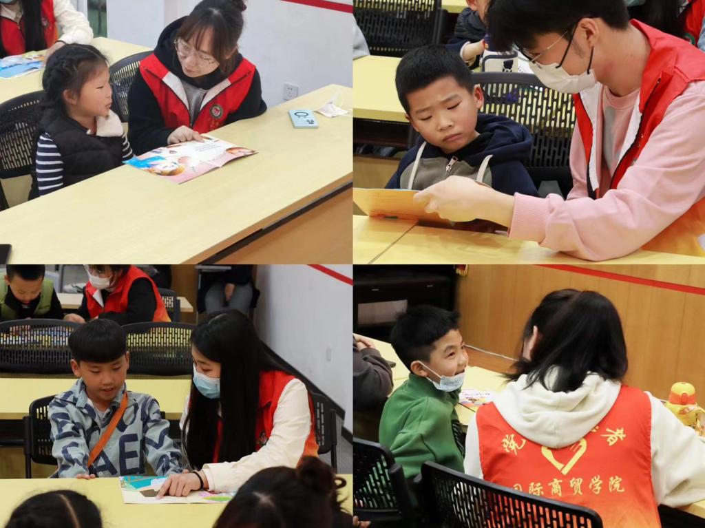 线下服务志愿活动开始后,由员工党员给小朋友们依次分发英文绘本。分发完毕后,员工党员分为五组,每组分别带领三位小朋友坐在提前安排好的座位上学习、观看绘本。观看绘本期间,员工党员绘声绘色地为小朋友讲解英语绘本内容,而商务英语专业和国际经济与贸易专业的员工党员更是发挥专业所长,游刃有余地带领小朋友们阅读英语绘本并积极耐心地引导他们,热情地为他们答疑解惑。