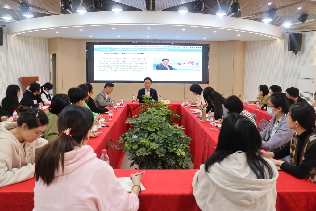 余闯董事长沿着习近平总书记考察浙江的足迹,从一枝一叶总关情、干在实处无止境、走在前列谋新篇、勇立潮头显担当和担负文化新使命等方面与师生做了深入的交流,讲述习近平总书记对浙江提出涵盖科技创新、推进共同富裕、深化改革和扩大开放、建设中华民族现代文明、坚持和加强党的全面领导等五个方面的要求。余闯董事长强调,我们要深刻领悟习近平总书记作出的“八八战略”对于浙江的重要性,20年来浙江的精彩蝶变在于“八八战略”的科学指引,要将习近平总书记考察浙江的重要讲话精神学习同深刻领会“八八战略”的内涵结合起来。