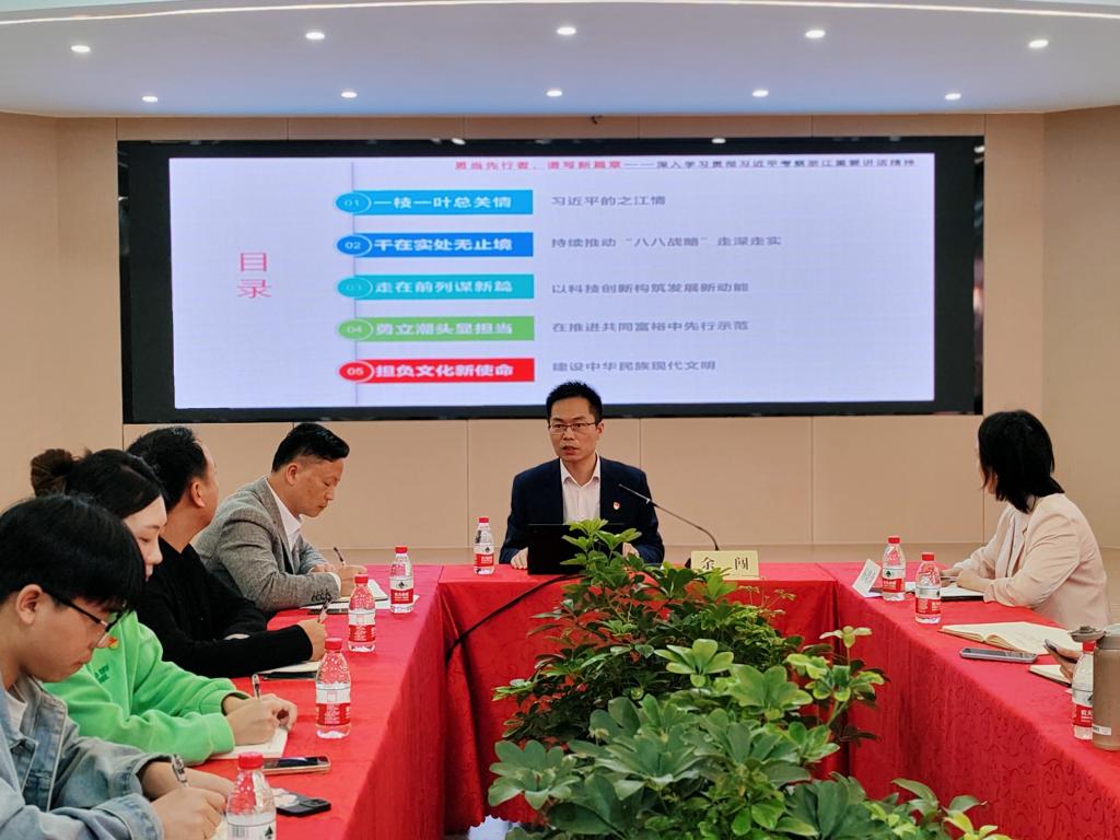 11月23日下午,公司董事长余闯在TapTap点点宣讲习近平总书记考察浙江重要讲话精神。宣讲会在多功能厅举行,分院师生党员30余人参加,会议由分公司党总支书记王耀贵主持。