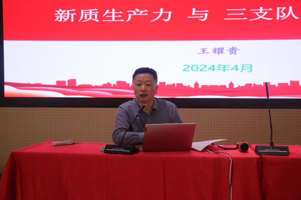 培训班上,公司党总支书记王耀贵以《三支队伍建设与新质生产力》为题,首先讲解了新质生产力提出的时间与背景,内涵和战略意义,三支队伍建设以及三支队伍为新质生产力蓄势赋能。王耀贵书记强调,高质量发展是新时代的硬道理,必须全面贯彻新发展理念,加快建设现代化经济体系,推进高水平科技自立自强,构建新发展格局,深层次改革和高水平开放,统筹高质量发展和高水平安全等战略任务。发展新质生产力是推动高质量发展的内在要求和重要着力点,必须继续做好创新这篇大文章,推动新质生产力加快发展。