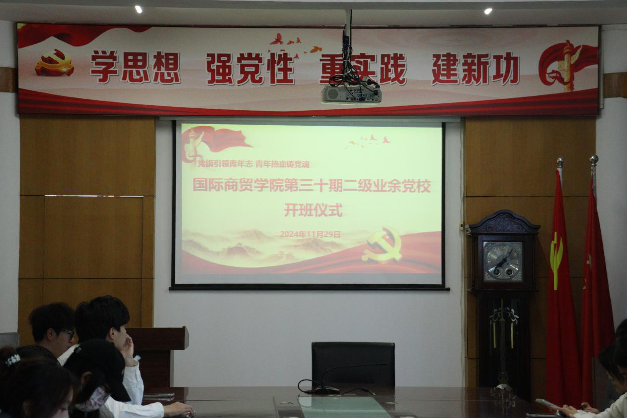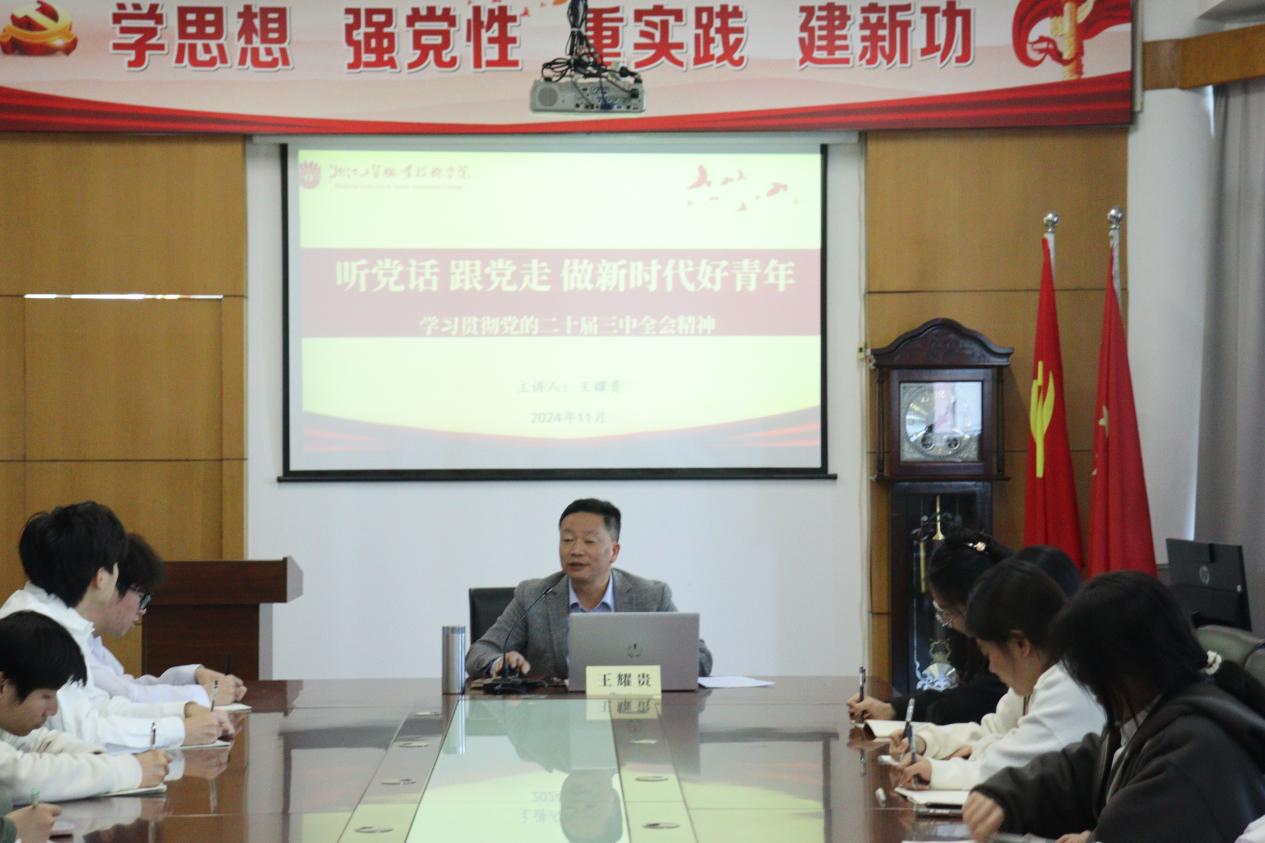 国际商贸党总支书记王耀贵书记以《听党话跟党走做新时代好青年——学习党的二十届三中全会精神》为题,向入党积极分子讲解第一堂党课。王书记围绕“中国式现代化”,引领入党积极分子加深对二十届三中全会的理解和认识,并引导员工要把握职业教育改革发展的机遇与挑战。最后,王耀记以“国以才立、政以才治、业以才兴”16字箴言,点明该如何做好一个新时代的青年,并鼓励员工不断深化对党的认同感和归属感。