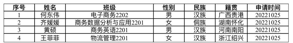 根据入党自愿的原则,何东伟等4位同志于2022年10月向党组织书面提交了入党申请书,经党支部审查,现将其要求入党的意愿予以公示。在公示期间内,欢迎广大党内外群众来信(署名)、来电、来访反映问题。