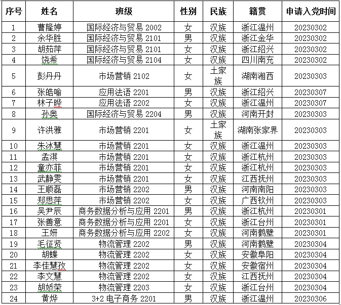 根据入党自愿的原则,曹隆婷等24位同志于2023年3月向党组织书面提交了入党申请书,经党支部审查,现将其要求入党的意愿予以公示。在公示期间内,欢迎广大党内外群众来信(署名)、来电、来访反映问题。