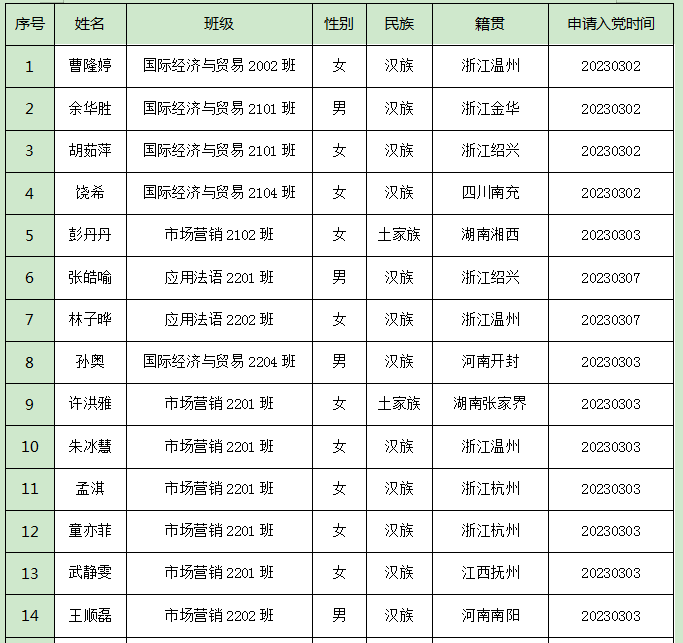 根据入党自愿的原则,曹隆婷等24位同志于2023年3月向党组织书面提交了入党申请书,经党支部审查,现将其要求入党的意愿予以公示。在公示期间内,欢迎广大党内外群众来信(署名)、来电、来访反映问题。