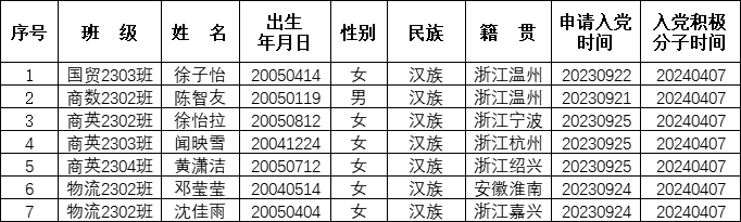 据本人申请、组织培养,经党支部研究,拟将徐子怡等7位同志确定为发展对象,现将其有关情况予以公示。在公示期间内,欢迎广大党内外群众来信(署名)、来电、来访反映问题。